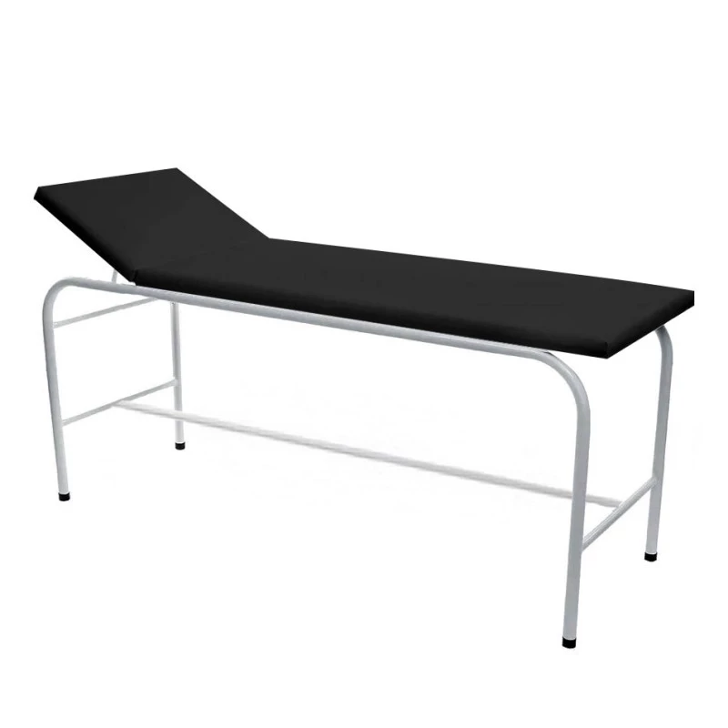 Divã clínico adulto com estrutura em aço, leito estofado em courvin, cabeceira reclinável em até 4 posições e pintura epóxi, disponível nas alturas 50 cm ou 60 cm, suportando até 150 kg.